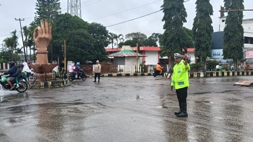 Di bawah rintik hujan dan aspal yang licin, sejumlah personel tampak bersiaga di titik-titik rawan kemacetan dan persimpangan utama. Menggunakan perlengkapan jas hujan lengkap, petugas dengan sigap memberikan aba-aba guna memastikan arus kendaraan tetap mengalir lancar dan mencegah terjadinya kecelakaan lalu lintas.